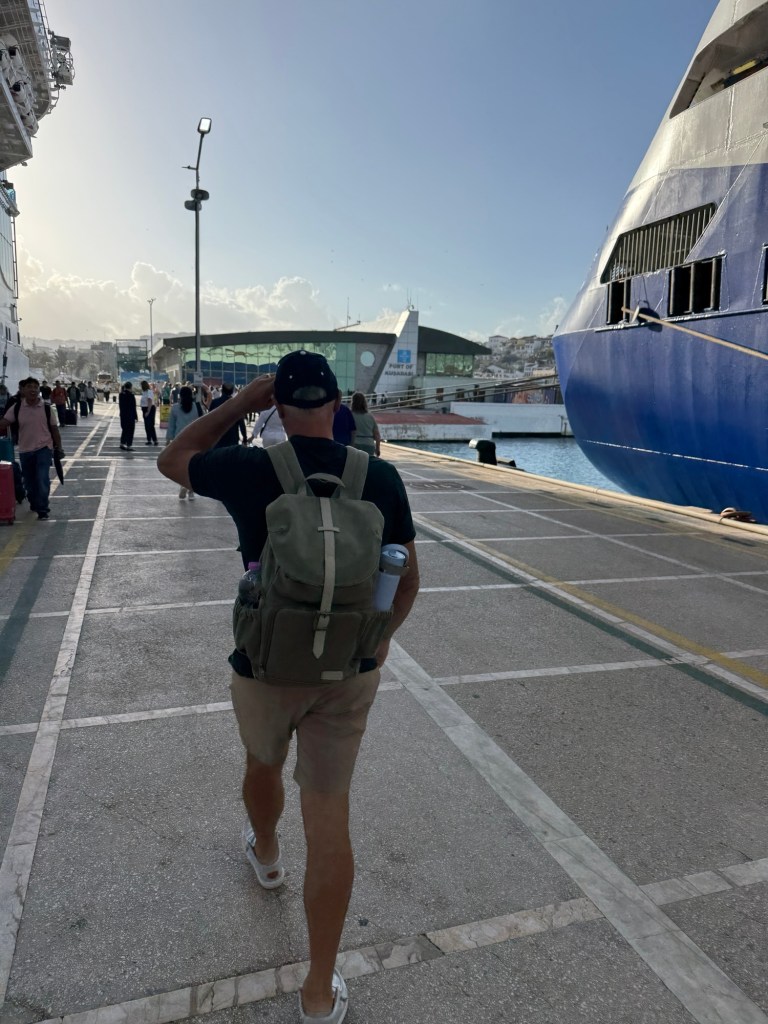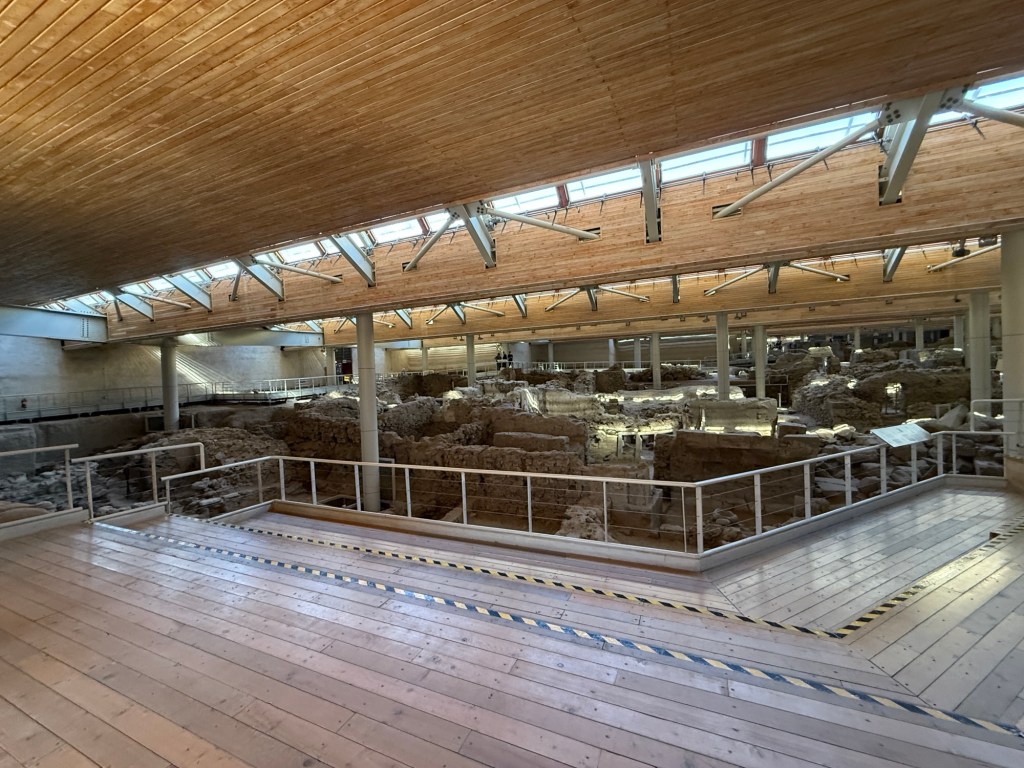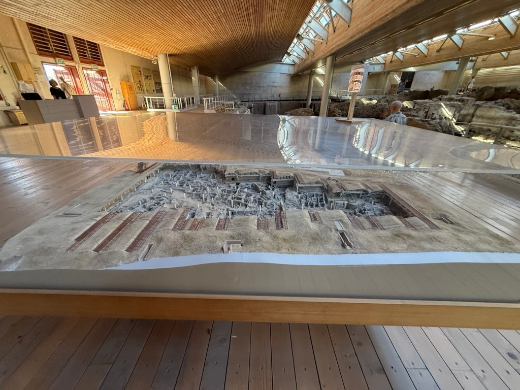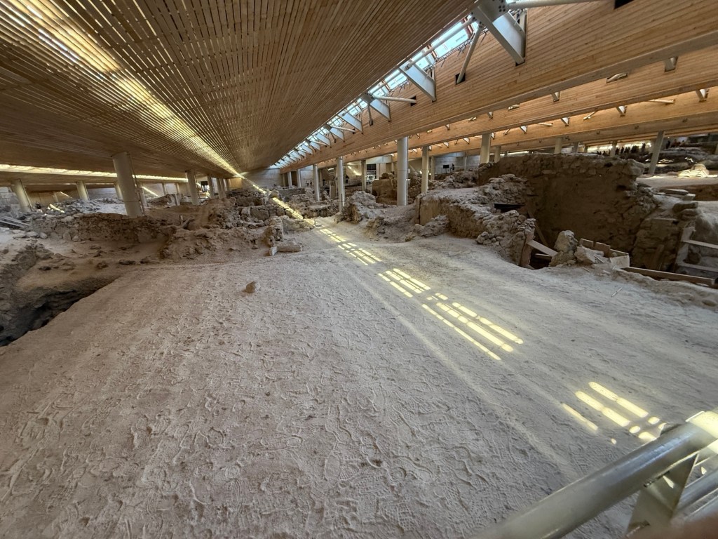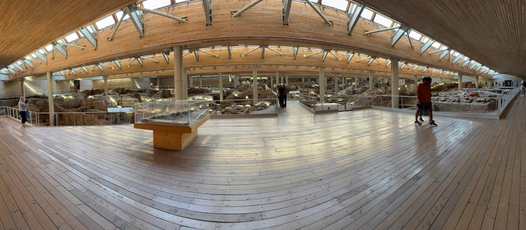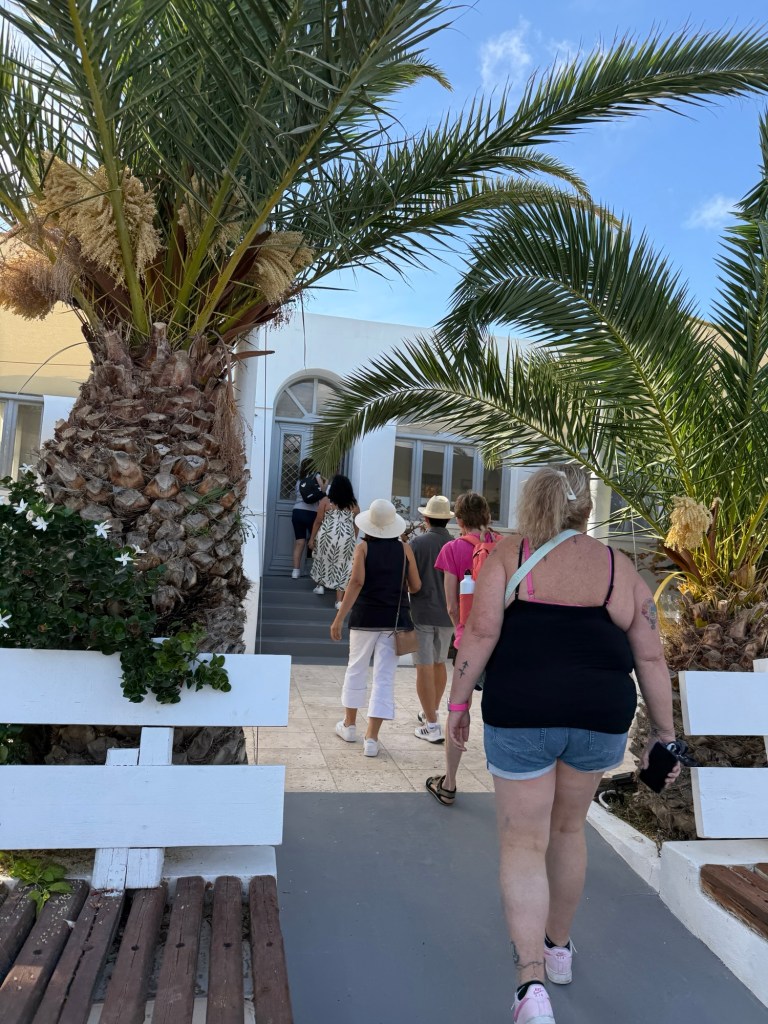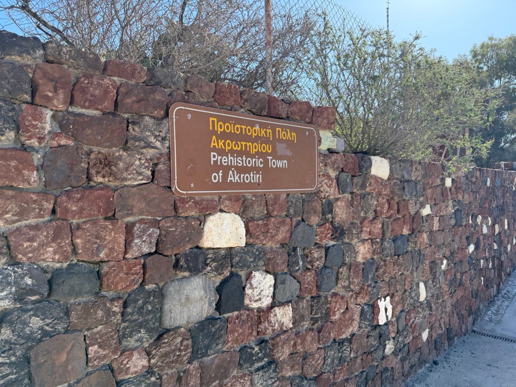 Mamma Mia when I start to my day, I read the paper and I 1000%. I’m sure that it said at 9 o’clock go down and get your tickets for the shuttle however when I went down there at 9 o’clock I was already given number 25 and they hadn’t even called one yet. Everything was running slightly behind. This was about to be Come a big issue for me with the outside tour that I have booked. I went and talked to Thomas who’s been in charge of a lot of the games that I’ve been playing on site and he did give me a nice princess wine stopper, but more importantly, he wrote on the back of my ticket, his name and cost of the two and got me to take a selfie with this and then sent me down to the pathway to get on the next available Tender. Once I got to the side, there was basically no lineup in grabbing the cable car to the top but when I got there is when things got complicated because nobody seemed to know where my pick up spot was, and there are no street names in East towns on this island. Don’t ask me what they do about the post. I was standing on the street where they knew that buses could be and that would be a good sign when I got the message from via tour that my group had left without me so my tour is booked for 1030 and according to the people that were on board, they left at 10:20. I was standing there flabbergasted and unsure what I should do. They said the next stop was the archeological site if I could join them there stunned I walked across the street to a gentleman standing with a Mercedes fancy van taxi and I paid $40 to take the 20 to 30 minute ride out to Akrotiri.