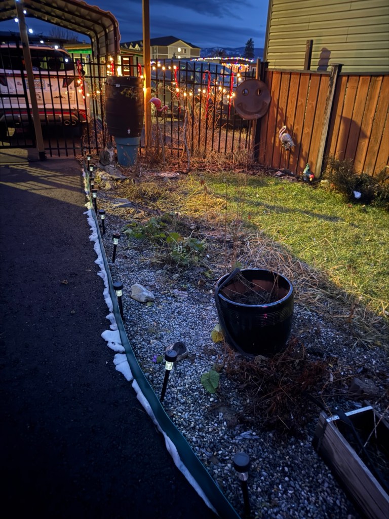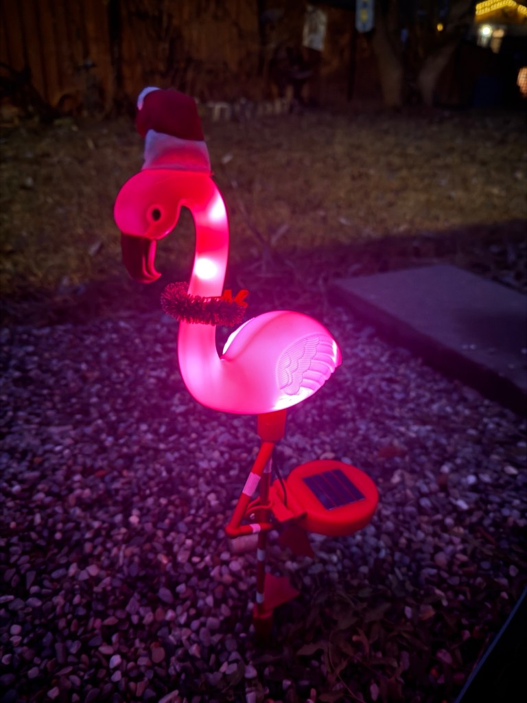 I puttered I doors and then went out to do a swack of yard work. I only have along the fence line left. The raspberries and Hollyhocks and willow have all been pruned and bagged. I also found my Christmas flamingo lights.