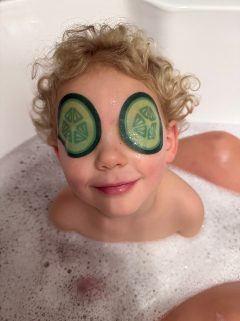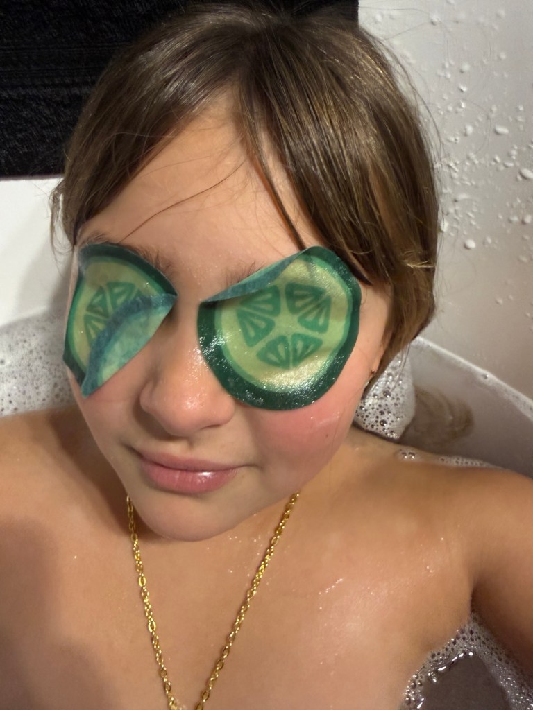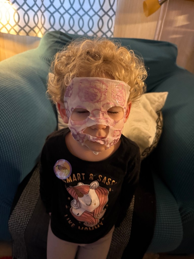 After dinner was more spa time. Emmy had also brought eye treatments. I love that Gwen’s favourite toys here are the wee plastic toaster, coffee maker and food processor that Rae and Ash played with when they were little.