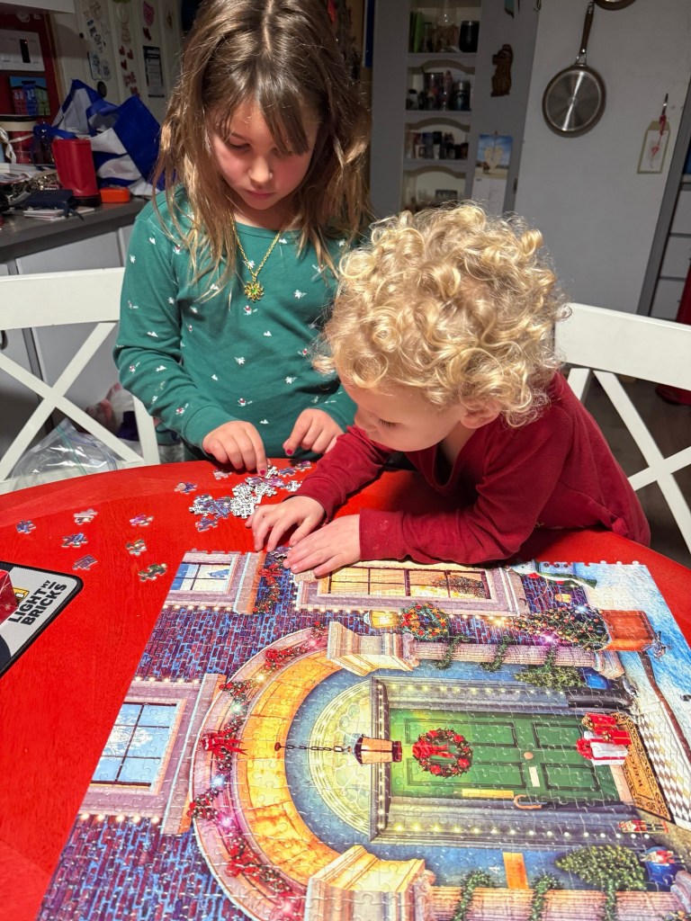 At 5:38 am I felt a little poke in my side and it was time to get up. After breakfast, Gwen couldn’t wait to do the days puzzle. She was pretty good at it for just turned 4. I had them get dressed and I did Emmy’s hair.