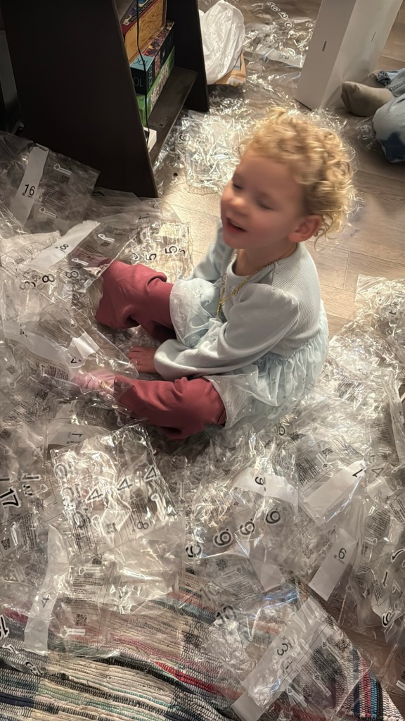 I had Emmy help me break down all my Lego boxes and we fit them in one big Lego bag. Gwen thought the parts bags were the best and finally helped us put them into bags for recycling