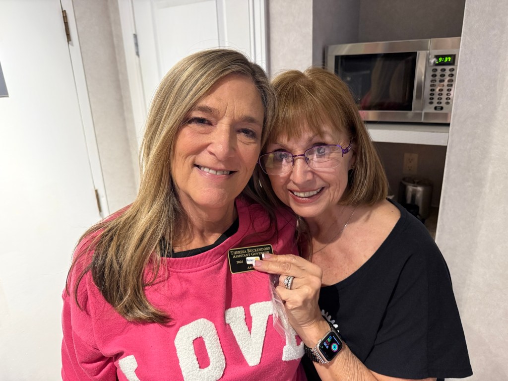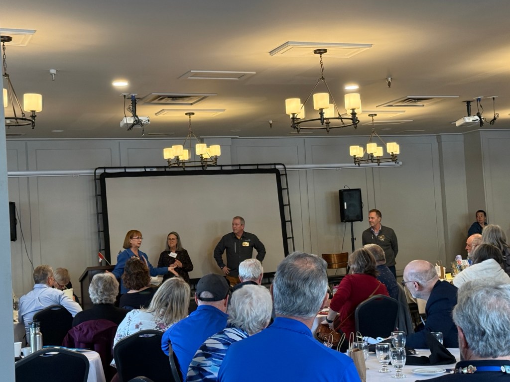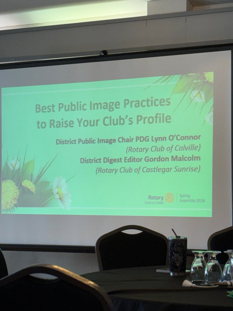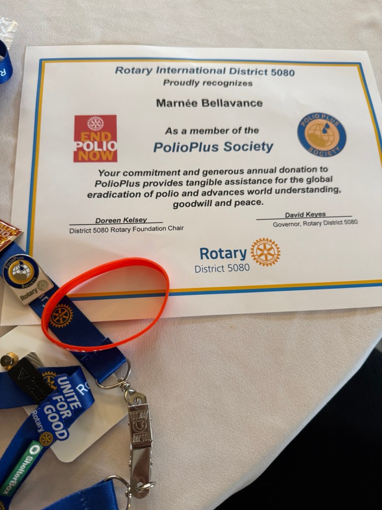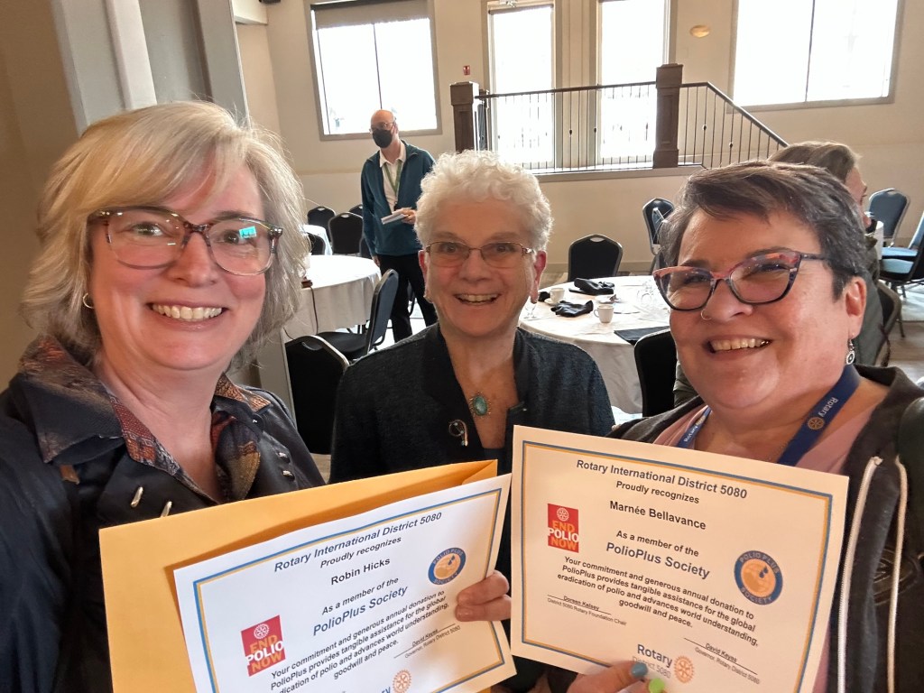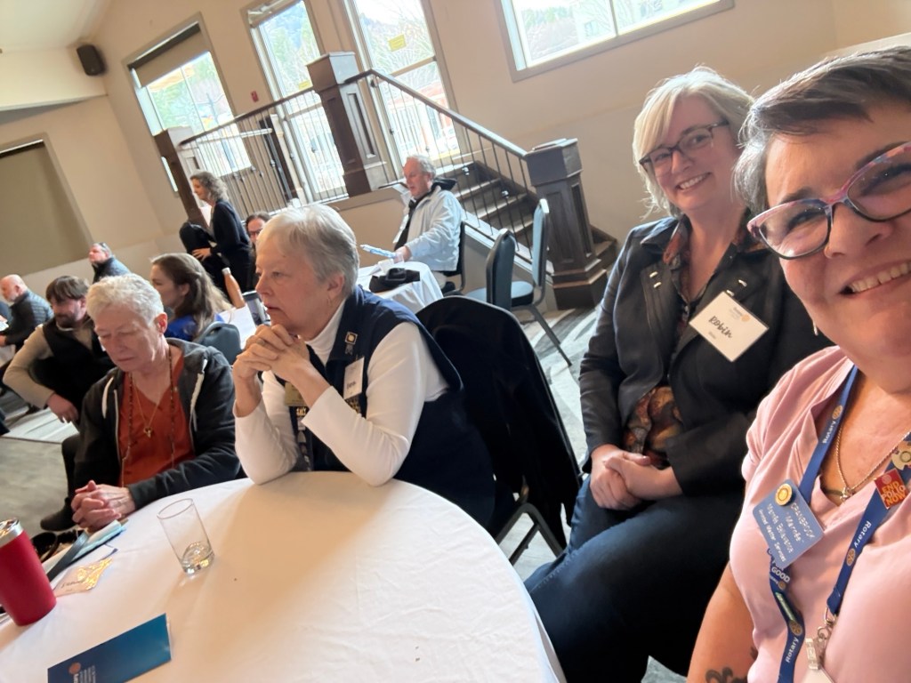 Once I arrived and got parked, I was happy to get a big hug from David Keyes our district governor and find a seat with Robin from our club. Three young women from the college joined us who are rotoractors and one of them, Maggie, will be on the club public image committee that I have been invited to be on at the district level. It was a sweet surprise when Steve Robert’s the upcoming district governor rid of the names of the people who would be on that committee. It was lovely to be recognized by people who’d come from the states as a regular at these assemblies and conferences. I attended several all good and informative sessions and was able to contribute as much as I learned. I was especially thrilled to learn that the keynote speaker was Joan from the Vancouver club, whom I had now interacted with twice. Once at her club when I went there for a meeting and also at the international conference in Calgary. Over the course of the evening we ended up having some great conversations and connections. She is a lovely powerful woman. Robin and I were presented with our polio plus certificates, pins and wristbands by Sheila Hart.