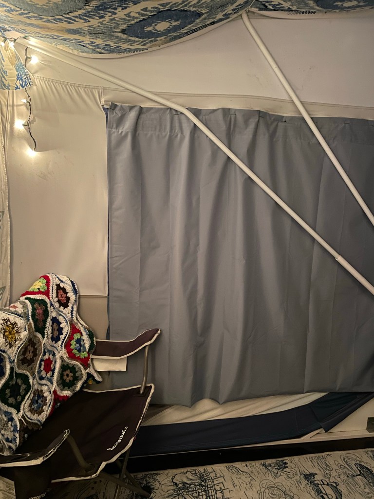 Through late afternoon and evening I took down one of the ceiling swag curtains in the trailer and put the beautiful piece of material I picked up at Fabricland. I then spent the rest of the time making two new curtains out of it for the side windows as they got some mildew stains I can’t get out. I haven’t sewn in a while but it was very enjoyable. They are not fully finished on all edges but I have a guest for the whole week so I had to get them finished ‘enough’ and hang them.