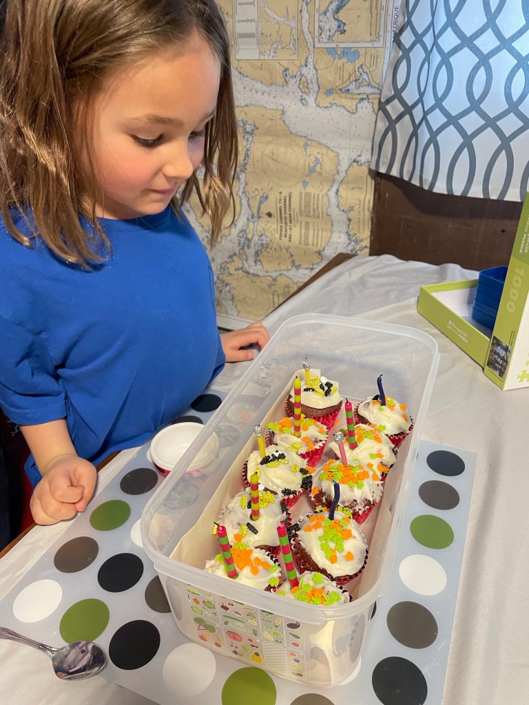 Emmy was so excited yesterday to play April Fools on her Dad and cousins that she had a list of things she could do. I woke up and set my bed like I was in it and went into the closet to get her Dad to tell her to come wake me. We had a good laugh when I startled her from the closet. She made a Kick Me sign and stuck it on her Dad. We made cupcakes to celebrate her birthday with her cousins and for me to take for my friend Galen’s birthday at poker tonight. After that Bill, Deanne, and the two international students came and helped move a sideboard to Mom’s that was her aunts and will hold the things she needs to access easily as her overhead cupboards are high. I then went to the hospital to see if she had been transferred yet and was told no but after I paid for parking and went up to the third floor it seems she already had been. I went to the Green Home to find I have to have a Covid test within 48 hours of visiting so they did one and I was finally able to see her in her new space. She has a private room and bath with a nice window to look out at and a nice sized flatscreen TV. She was sitting in a wheelchair when I got there, watching curling. She needed a little cheering up and it was nice that when they came around with snacks we were able to have a coffee and cookie together as we laughed that she got a room with a stripper pole. I have a list of clothes to pick up for her and bring tomorrow as she can wear normal ones now which is nice for her to start feeling on the mend. She will have physio 5 days a week and I was there to help complete the paperwork and history for her with the nurse. I feel she will get the care she needs there and it will be good for her. Next it was to the Guedes house for a visit and to celebrate Emmy turning 6 on Wednesday. I left and went for a much needed pedicure before returning for a lovely ham dinner with the family. Sawyer came to stay over with Emmy at my place. I helped get them settled and then headed to my poker game. I just left, having been the 7th one left at the table. It was a nice night and Galen liked his cupcakes and I sent some home with him for his wife and daughter. I am very tired and hope to catch up a little tonight as it will be a busy week coming up.
