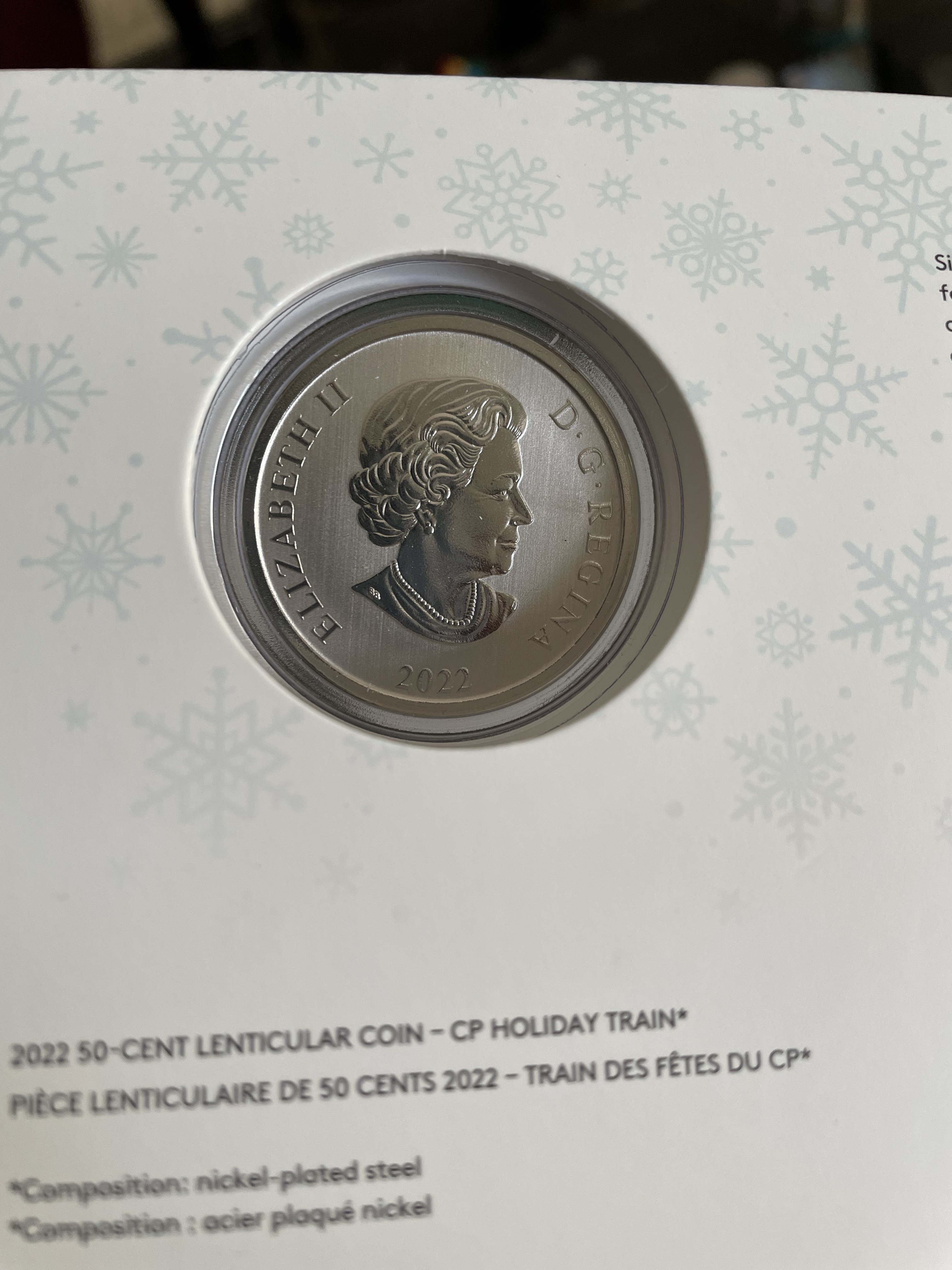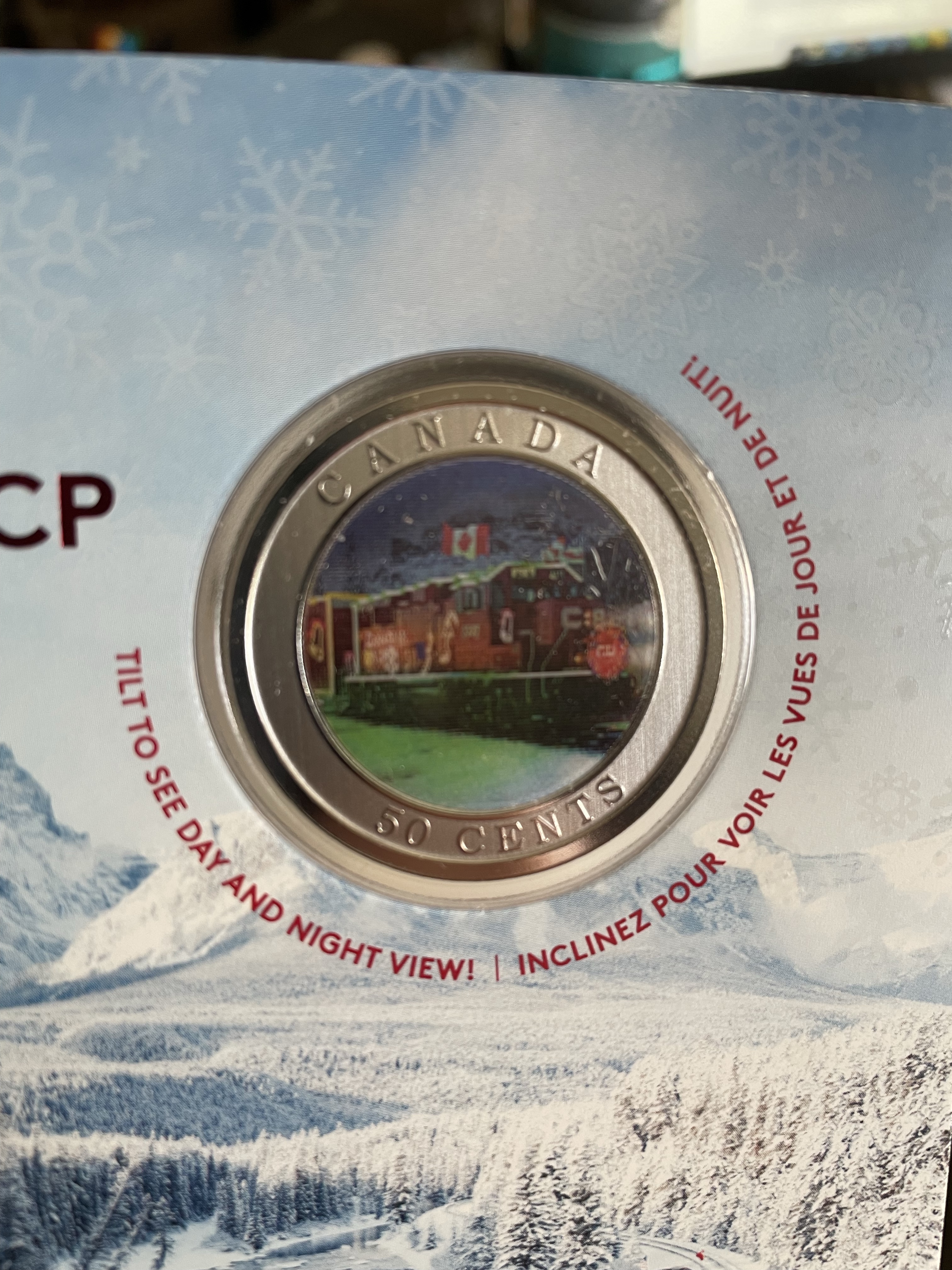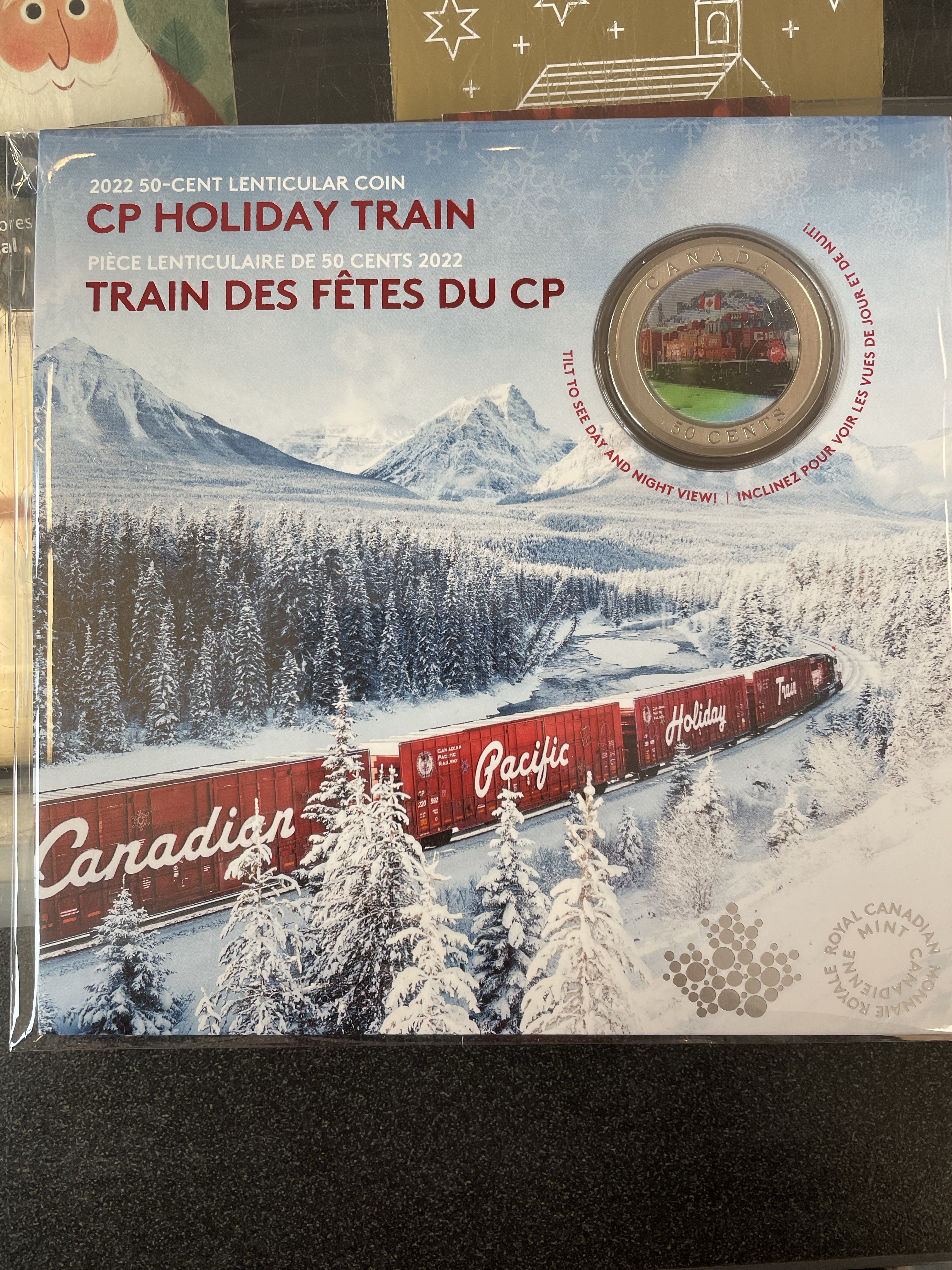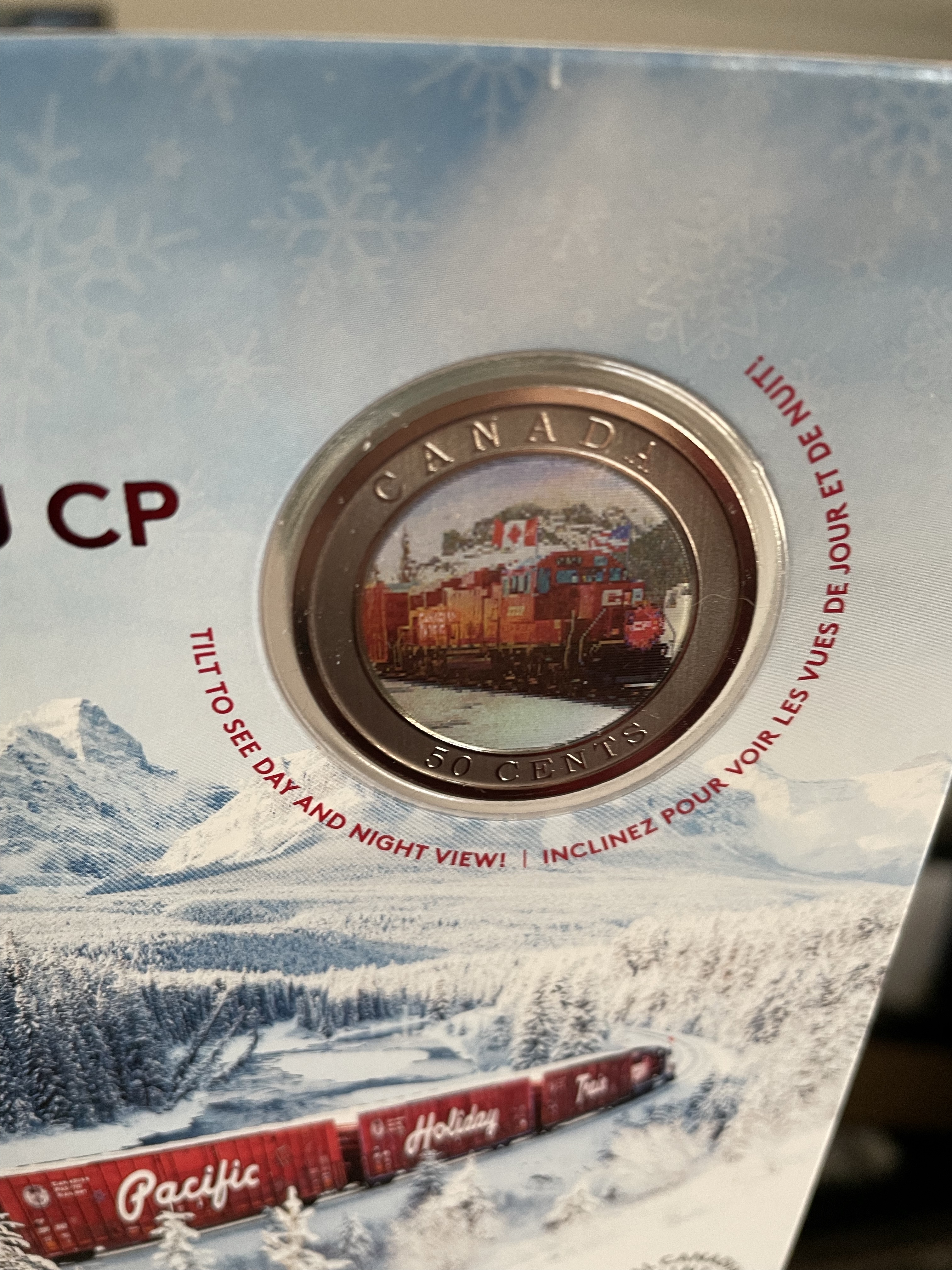 Today began as always, on the treadmill, watching Netflix. I am nearly done season three of YOU. It is a quirky show and completely fantastical. In some ways it is honest in its portrayal of relationships, the twisted thinking that is there. Work was calm and smooth again and much got done. I did take some time to go to the post office and send off my parcel to the UK. Can’t wait for my besties to get the package of festivities. I do understand why shipping is so expensive when you order something on line as Canada Post is very expensive. I am grateful to have saved some money through using my small business discount card. All worth it to share the joy of the season though! And such a festive box, don’t you think?! While I was there I remembered that Mark had told me about the CP Rail holiday train collector coin. Of course I had to have it. I was showing it to Emmy when I realized it shows day and night views, how trippy is that?