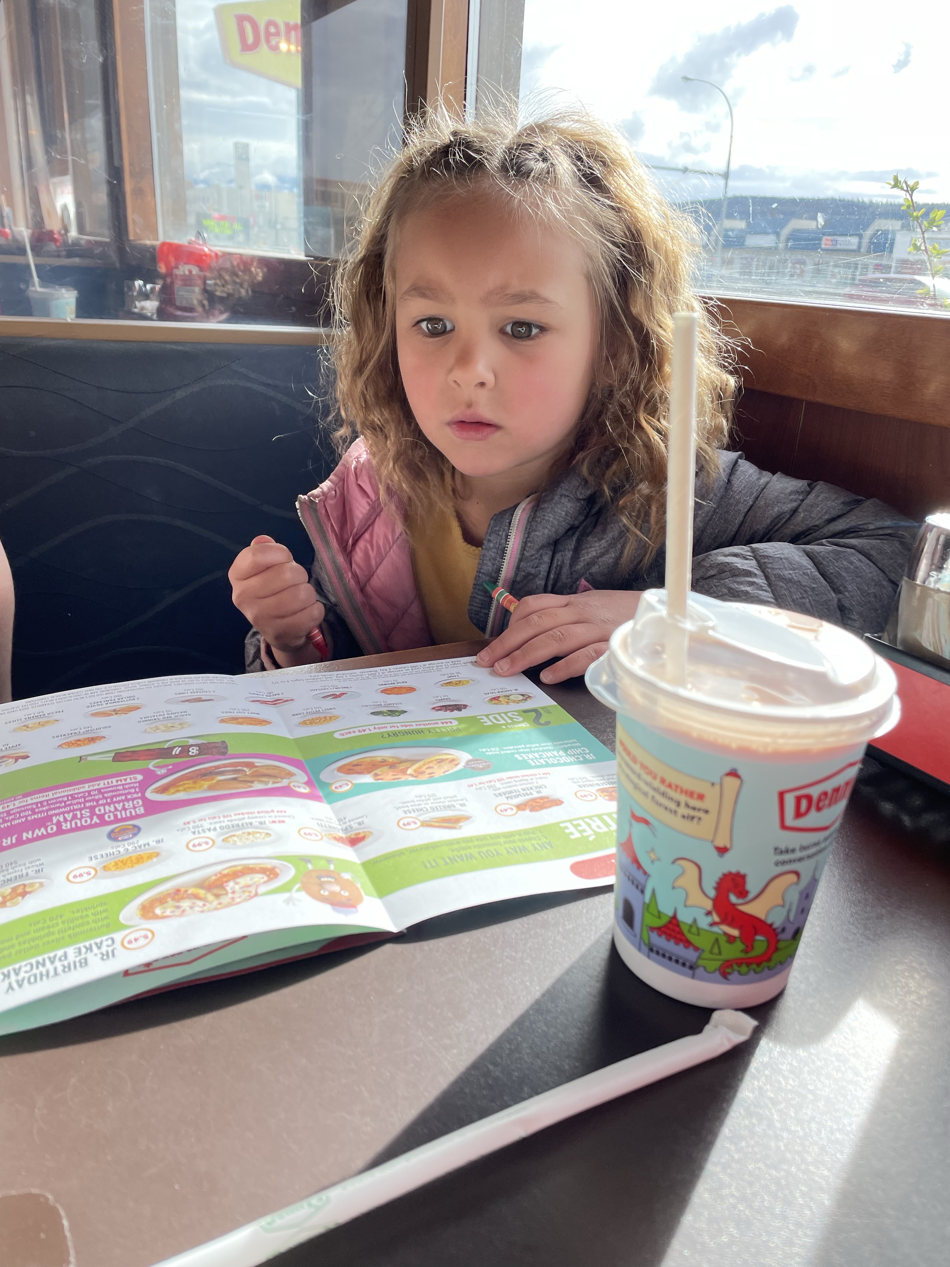 Up early and picked up by Danika to buy breakfast for her and the girls at Denny’s. Emmy was quite chuffed that she brought me a gift of pottery pieces she had picked out that “Only cost $5!!”. They are very cute. We had a nice visit and called my Mom to wish her a Happy Birthday. Gwen is a little sweetie as well, nice to have a bonus grandchild. I got a weird text after we left.
