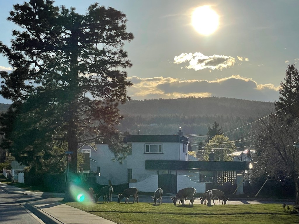 There are a lot of deer around these days but I had to pull over and take a picture when I saw this wee herd in the sunset.