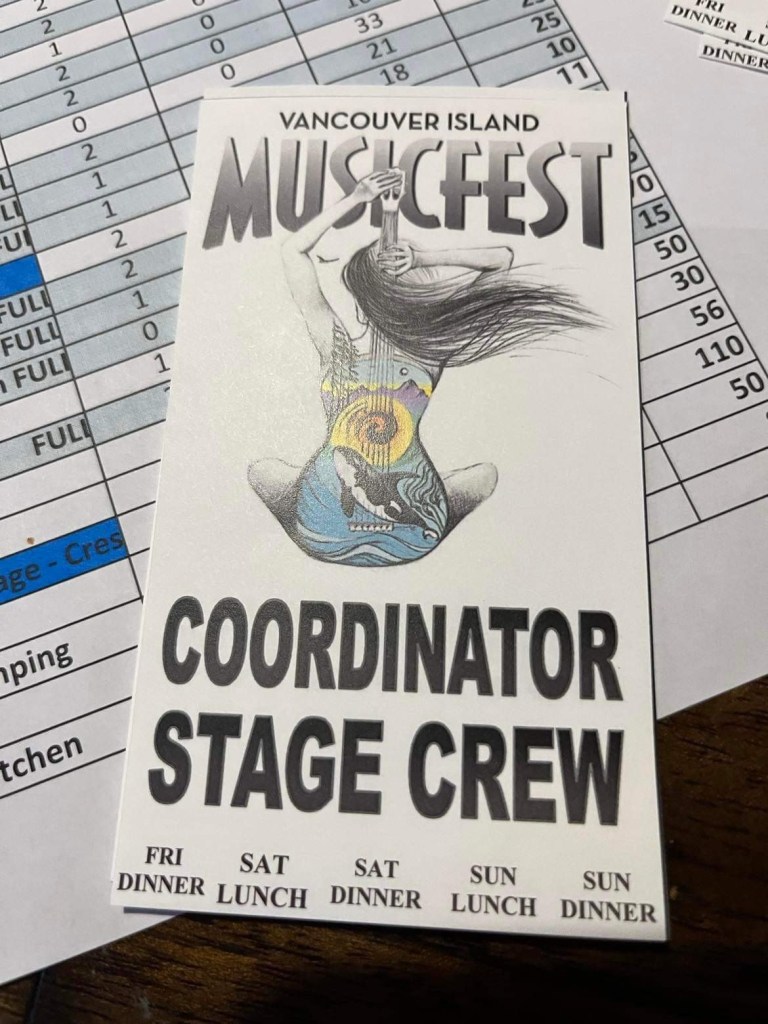 I was up at 6 with mom’s good old clock radio and after a couple coffee and a shower headed for the Tsawwassen Ferry Terminal arriving around 8:45 and assured I would be on the 10:15 to Nanaimo. I enjoyed a traditional breakfast, read my book, napped a little and mostly stared at the beautiful Salish Sea. It has been 2.5 years since I have seen the ocean and it was good for my soul. The trip was uneventful and we were in fact ahead of schedule when we docked. The drive up island was busy as always through the outskirts of Nanaimo but cleared mainly as I hit the Freeway. The closer I got to Courtenay, the more emotional I was getting in anticipation of seeing friends that I have only texted, emailed or had brief chats with since MusicFest 2019. I parked, took my, I’m Here! Photo, picked up my credentials and hitched a ride with Tiny (after a big hug) to find Doug, Marcy and Cresslynn. It was raining but the public camping was lined up and beginning to fill as Doug and I sat in his cart and caught up (if that is possible). At one point a young lad came and stood in front of me and said Hey, I know you. Lincoln! I exclaimed and we took our Fest Face pic. He has grown so much and I was so happy he remembered me. I spent the rest of the afternoon getting little rides around the site, having great discussions and settling in. I set up my car camp in the site crew spot and they ran me power for my CPAP and charging. Blair picked me up and bought us dinner from a great food truck, the Phat Parrot, which we took to his place for a visit and I completed a payroll before he helped me put the binders for all the stage managers and tech crew for each stage. We had a nice time and then he dropped me back at the site where I promptly ended up at Val’s camp spot for a few too many beverages and great catch up with her, Mike and Jackie. I rarely got opportunity for good visits in the few years previous but I am very ready ahead this year in fear of forgetting anything (only my Fitbit so far).