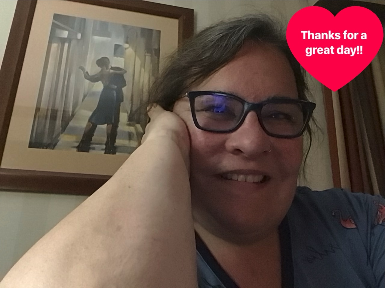 I woke up at 3:15 am and had fitful sleep for the rest of the night. When I was finally ready to get up for work, my right lower front and back quadrant really hurt. It was painful to the touch and moving around was awkward and pain filled. I met Galen and Doug at the theatre with my car full and let them unload it, then it was off to a very full day at the office. I spent half of it on paid and half on volunteer work. My back was aching sitting at my desk so Keri went into Sean’s office (he’s away on a work trip) and borrowed his vibrating obusform, Cindy gave me robaxacet and I was good to stay and work. I got up as often as I could to walk around and stretch and by the time I got home I was feeling slightly better although I have spent the evening with a heating pad on it. My hands are also bruised. I think it all happened when the wind took control while we were taking down one of the circus style tents on Saturday. I was supporting the centre pole and didn’t want to drop it. I wasn’t thinking about my surgery and recovery and that I hadn’t done much for the last 5 weeks. I had a good laugh today when my Linda in the UK sent me a message she saw that she knew would make me laugh and I replied with a photo saying I was feeling fiery hot and maybe I need my chimney swept. It is fun to giggle across the miles.