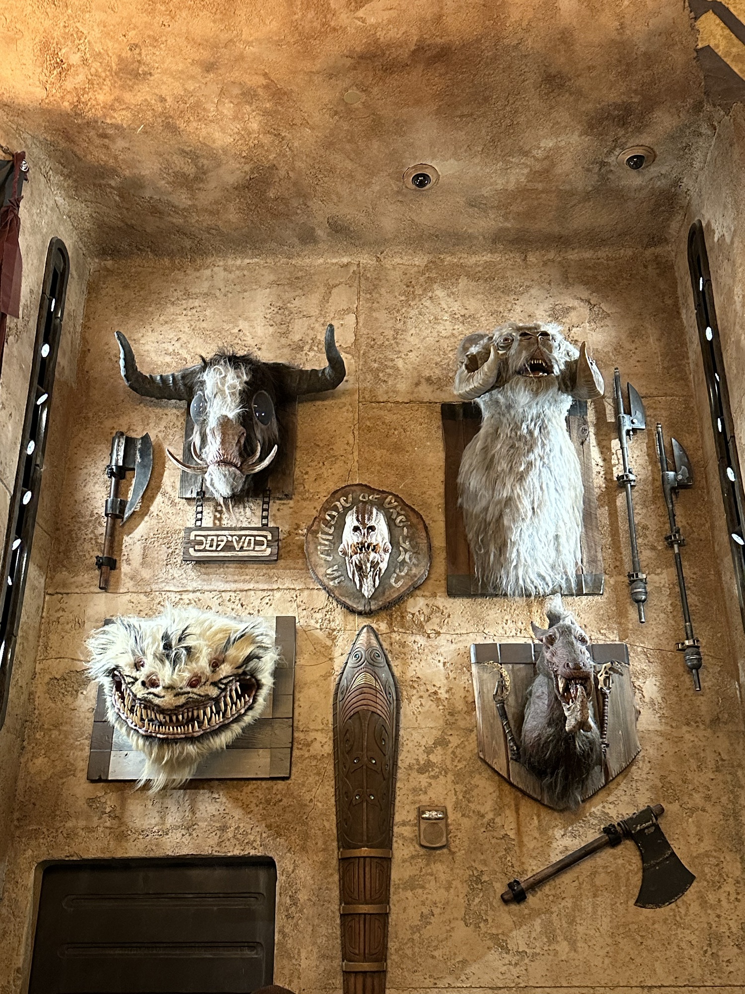 We decided everyone needed food so headed out of the area, up the big levels of escalators, through Springfield and stopped at various places to eat. Rae, Roger, Gene, Will, Sawyer and I all ate at Three Broomsticks in the Harry Potter area. It was so delicious and I bought special ButterBeer in a collector glass for Will and Dragon Scale Lager in a WartHog glass for me.