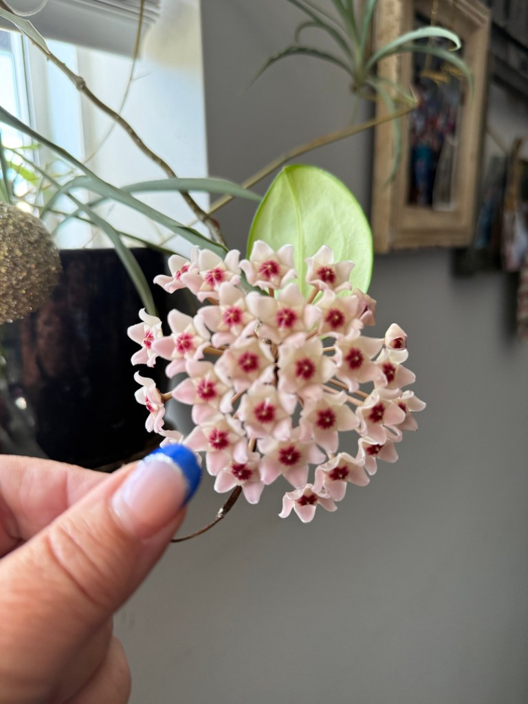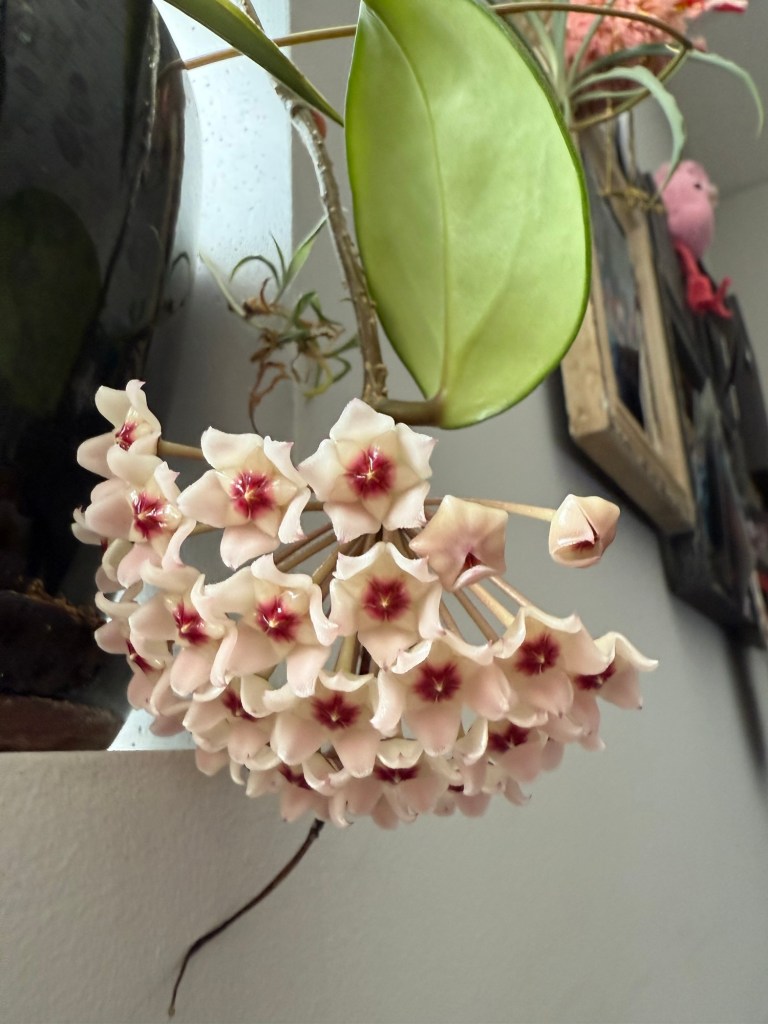 When she came around to bring water for our plants, I was shocked and amazed to find that my Hoya had flowered after all these years. I call it my Nana plant because it was her favourite and I’m so happy that it bloomed.