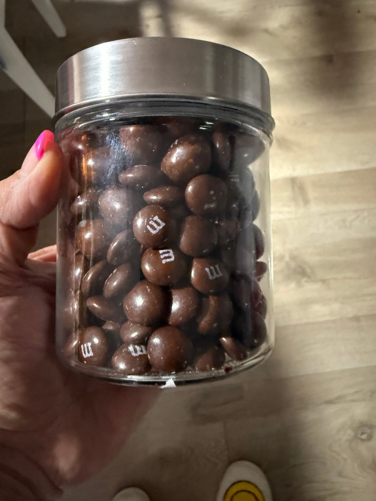 I was taking out for a delicious lunch at the Heid-out today by Rosie, who is in town to help out with her brother Dan’s wife, Terry. Terry has very bad dementia and can’t be left alone and it’s Dan’s grad reunion weekend. We had a super good visit and a delicious burger, and I went back to the office. I did get quite a bit done and one of the ideas that we came up with over lunch I followed up on. In one of my favourite bands riders hidden in the sound rider was a comment that they would like to have the Brown M&M’s that Van Halen didn’t want. I went to the boat barn after work and stayed and visited with a manager Lukas, who was good friends with my grandson Gene. While we chatted, I use the scoop to pick out as many of the brown ones as I could, and then I went down the mall to the dollar store and found a nice screw top jar to put them in. Lukas also gave me a very good deal on them because he’s a sweetie and he said he’s had many meals at his house so wanted to give me a deal. I came home and washed the jar and it turns out I had exactly the number of brown M&Ms to fill it.
