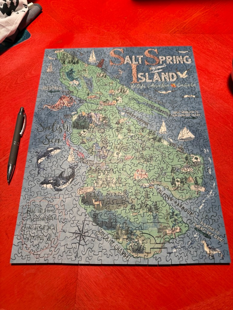 I was reminiscing this morning as I finished the wooden Salt Spring puzzle that I borrowed from Rae. The puzzle itself was challenging because of the shape of the pieces, but the map itself was a walk down memory lane. I didn’t have to look at the box to know where the roads and lakes were etc.. It occurred to me then that I had lived for 15 years on Salt Spring and it has now been 15 since I left. I had a good life, good friends, great experiences, and provided a wonderful space for my son. It really was a significant time in both our lives. There is much I miss about it.