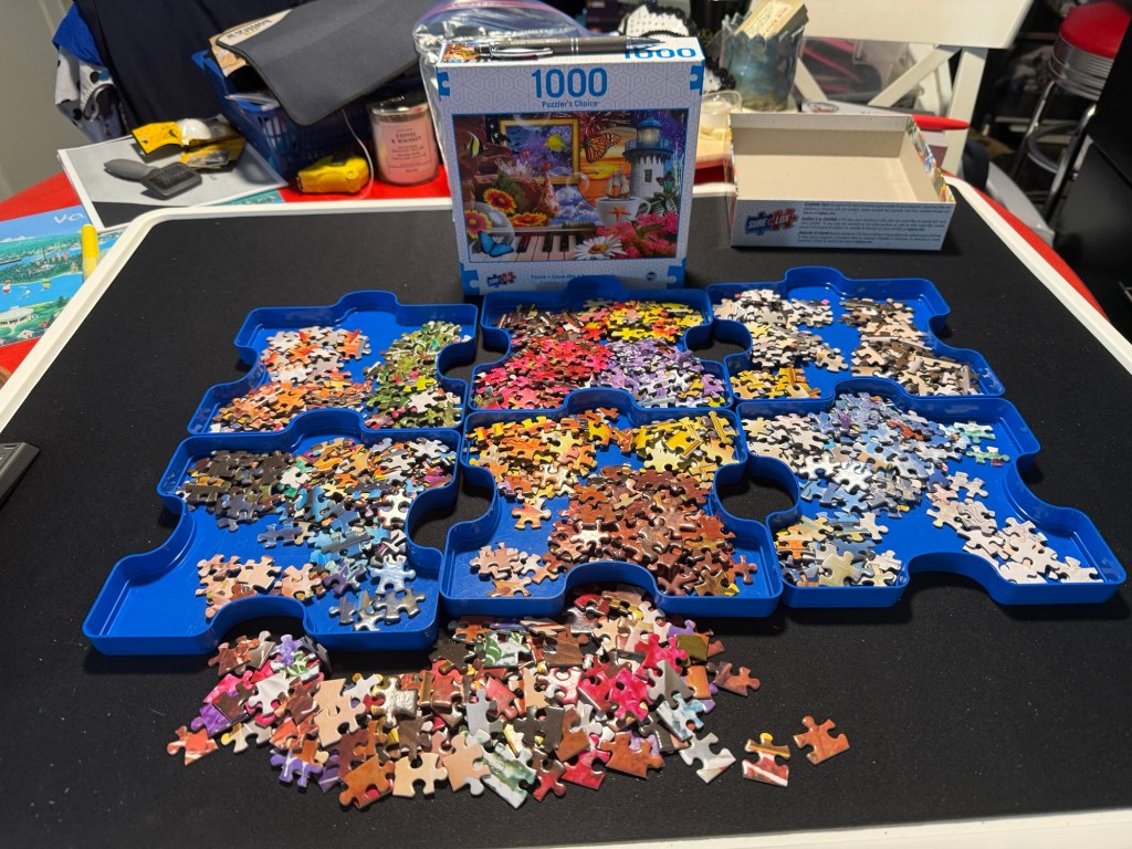It was decently cool this morning, so I got out and mowed my lawn. If I didn’t do it soon I was going to need to bale it. So I had a coffee and sorted my puzzle pieces and headed out.