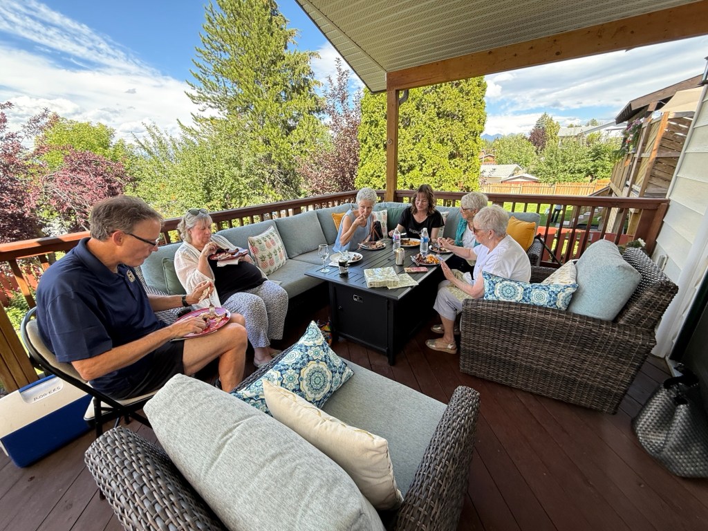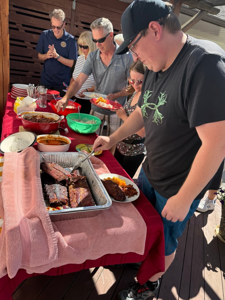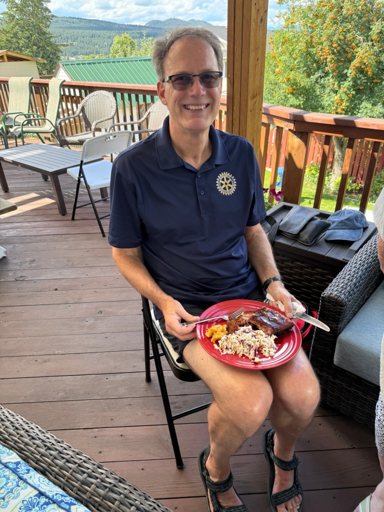I came back in had some food worked on my puzzle, then showered and got ready to head to Rotary on the rocks at the Popoff’s house. They have such a lovely spot which held almost 30 of us and Ron had done incredible barbecued ribs, mac & cheese coleslaw, and Johanna’s delicious desserts. It was a nice turn out lots of good conversation and laughs. I was tasked by our social media crew to take pictures and at least one video for them to use.
