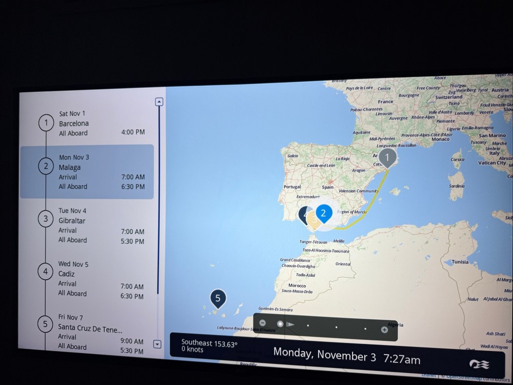 I was up at a decent time and Wendy messaged me to join her for breakfast. She had a lovely spot beside the window and I had a lobster. Benny was amazing. We hung out for the morning, including going to sessions about the transition from this cruise to the next one as I learned I am actually on the back-to-back cruise and when Wendy and her crew and Ginger and Glynn get off in Barcelona, that will be the end of the first leg of the trip. When I come back to the ship after my day in Barcelona, I will be having a stamp in my passport and officially have left the EU, even though it is weird because we are still going to Seville and Tenerife that are part of the EU.