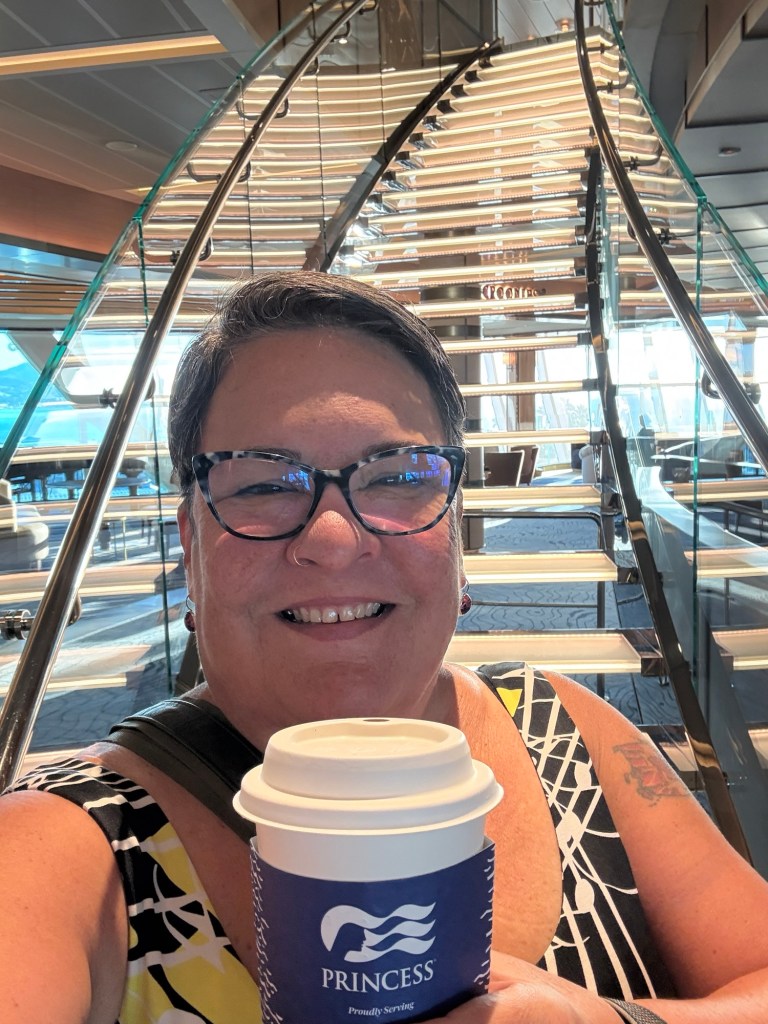 I didn’t have an alarm set yet. I still woke up early, so I texted Wendy because I knew she would be up and met her for real breakfast. I had a French toast and she had a frittata, and then we went for a bit of a tour and then sat on the Lido deck with our feet in the pool. It was nice there was hardly anyone around because it was so early in the morning. My ankle has been bothering me quite a bit from putting it through the paces. after that we went to the Princess Arena for a Life at Sea presentation by our cruise director, Cole, who is a 28 year old retired dancer from New Zealand. He showed us how the crew lives behind the scenes