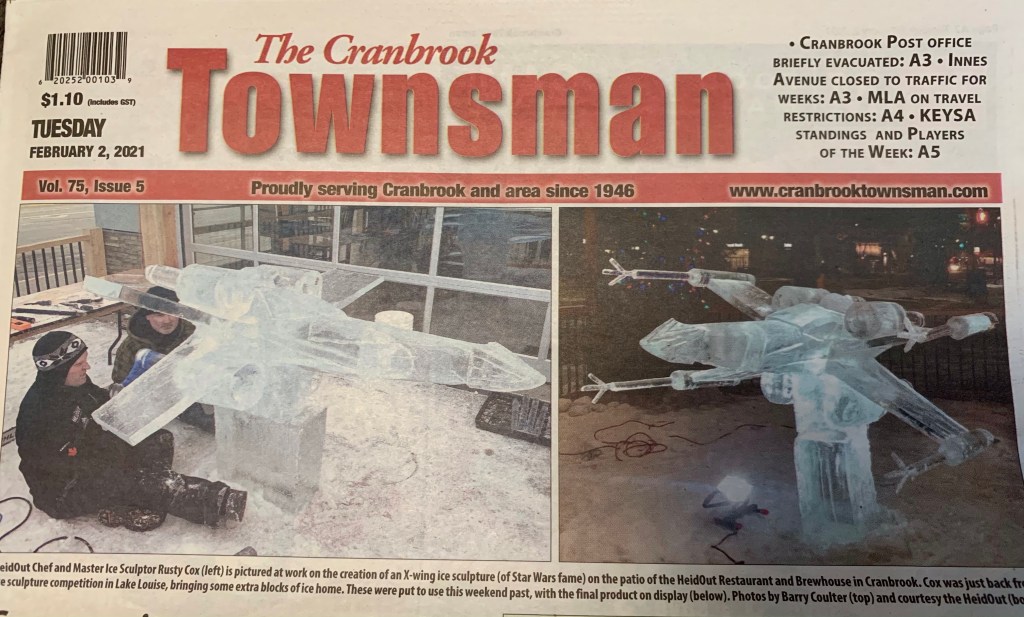 I was glad to see the front page of the paper today as somehow I had managed not to make it downtown to see the ice x-wing.